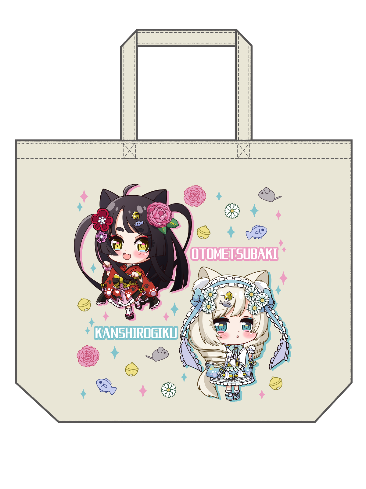 招き猫の女の子、つばきちゃん&しろちゃんのSDキャラクターのトートバックです。