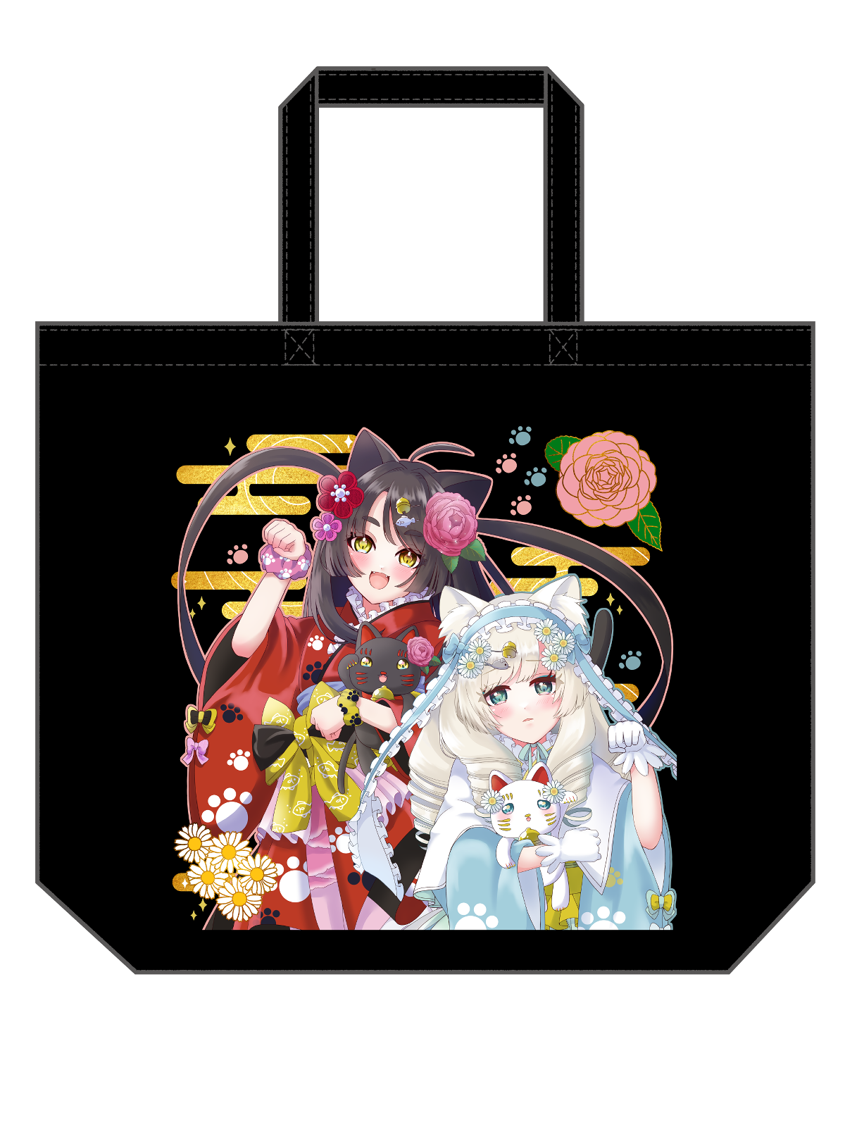 招き猫の女の子、つばきちゃん&しろちゃんの通常等身イラストのトートバックです。