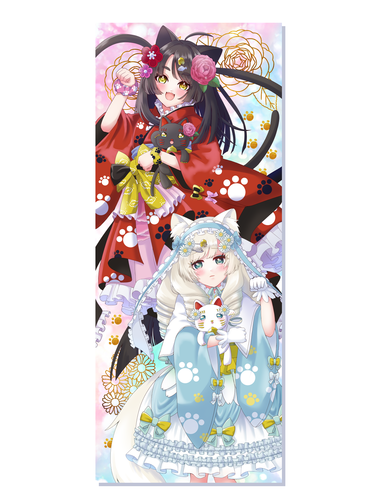 招き猫の女の子、つばきちゃん&しろちゃんの通常等身イラストのフェイスタオルです。